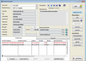 Zu einem Gerät können beliebig viele Prüftermine, beispielsweise für TÜV, Inspektion, Geräteprüfung (wie z.B. Prüfung elektrischer Geräte nach DIN VDE 0701-0702, BGV A3 Prüfung, DGUV, etc.) oder Garantieablauf mit Folgefristen verwaltet werden, die Historie wird jeweils mit angezeigt.