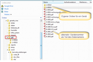 Das Programm sucht nach Dokumenten, die zum ausgewählten Gerät gehören. Gefunden werden dabei alle Dokumente, bei denen die Gerätenummer Teil des Dateinamens ist oder die in einem Ordner abgelegt wurden, dessen Name der Gerätenummer entspricht.